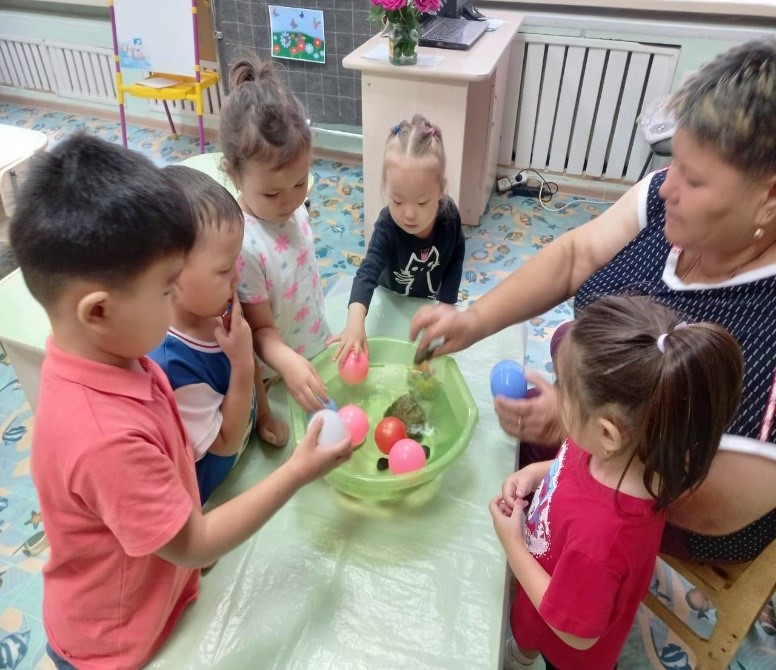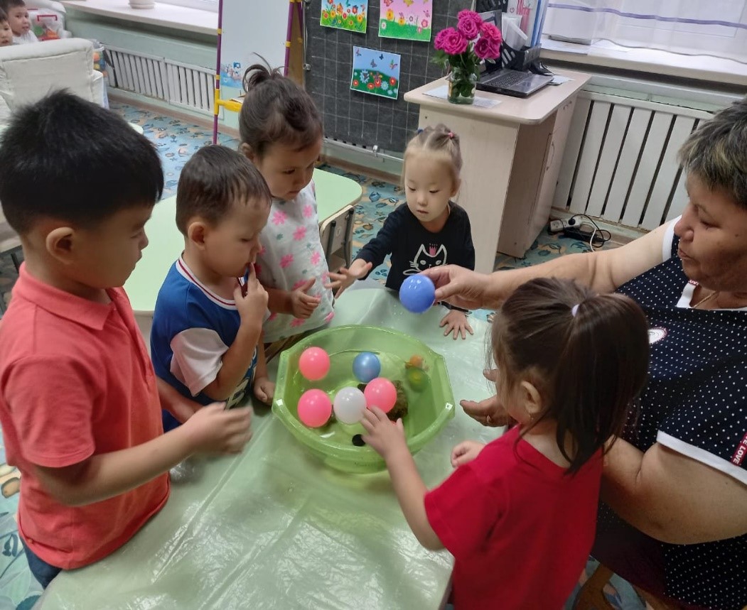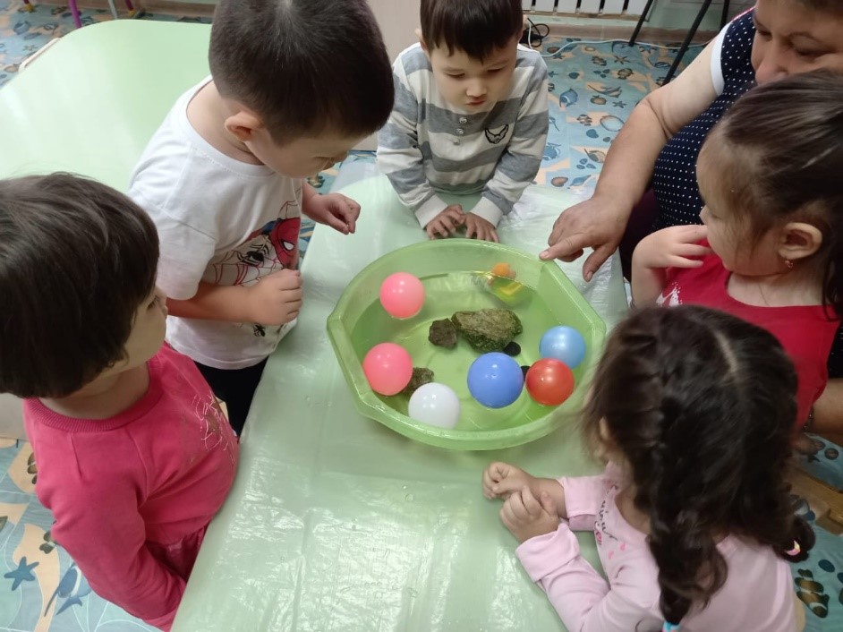 Балалар тастардың қалай батып, шарлардың су бетінде қалықтағаның қызығушылықпен тамашалады. Балалар кейбір заттардың суға батып кететінің, ал басқалары су бетінде қалқып жүретінің білді. Жүзу, ауыр, жеңіл деген сөздер арқылы балалардың сөздік қорын байыттық.