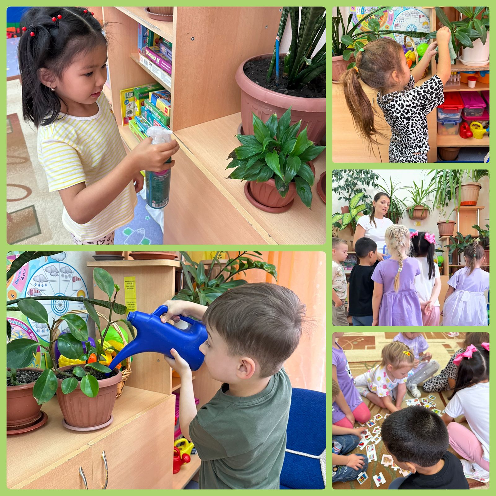 "Аққу" тобындағы табиғат бұрышы. Бөлме өсімдіктері тек безендіру ғана емес, сонымен қатар балаларды экологиялық тәрбиелеудің маңызды бөлігі болып табылады. Балалар гүлдерге қызығушылықпен қарайды: суару, жапырақтарды сүрту, өсуді бақылау. Осылайша олар қамқорлықты, жауапкершілікті және табиғатқа деген сүйіспеншілікті үйренеді.
