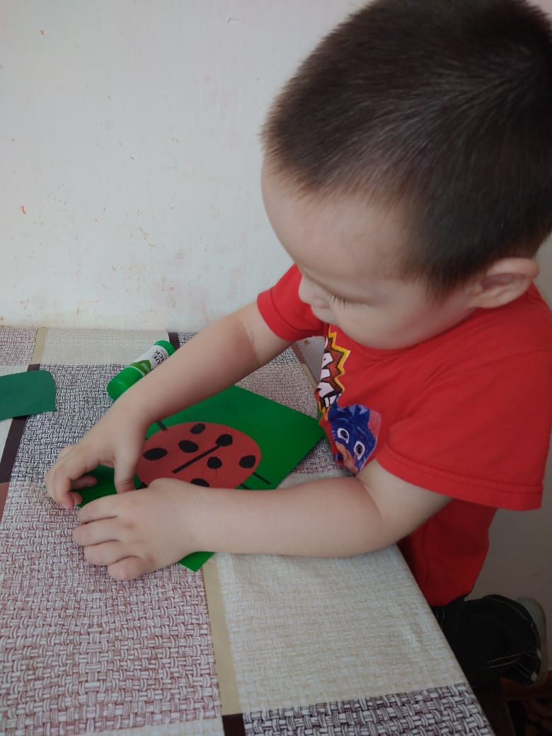 - Қанқыздың табиғат аясында, шөптердің арасында серуендеп жүргенін бейнелеу үшін үлгіге қарай отырып, осы суретті аяқтап салуымыз керек. Біз шөптердің суретін жасыл бояуды пайдаланып сүйкей жағу арқылы саламыз.