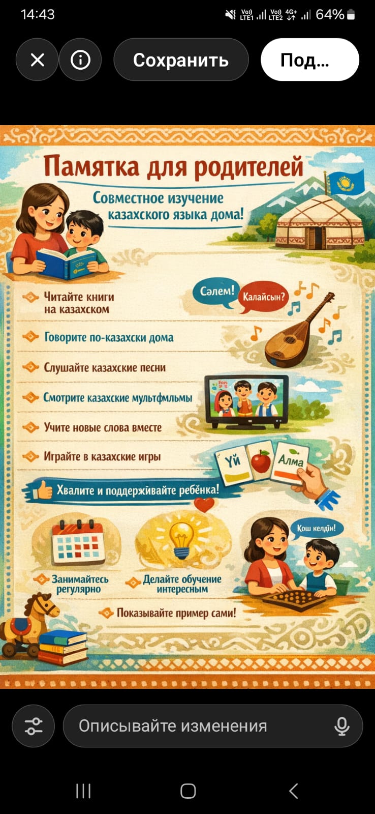 Мектеп жасына дейінгі балаларға арналған қазақ тілін үйрену уақыт талабы болып табылады. Бірақ тіл тек қарым-қатынас құралы емес. Тілді ерте оқыту баланың коммуникативті, танымдық, интеллектуалдық қабілеттерін дамытып қана қоймай, халықтың салт-дәстүрлері мен әдет-ғұрыптарына деген қызығушылықты, сондай-ақ Отанға деген патриоттық сезімді қалыптастырады. Балабақша мен отбасының бірлескен жұмысы балаға қазақ тілін оңай және табиғи меңгеруге көмектеседі. Үйде қолдау, балабақшада алынған нәтижені айтарлықтай арттырады. Негізгі шарт-елеусіздік, жүйелілік және жағымды эмоциялар. Есте сақтау маңызды: мінсіз айтылуды талап етпеңіз баланы басқалармен салыстырмаңыз сәттілік жағдайын жасаңыз тілді үйрену қуаныш әкелуі керек